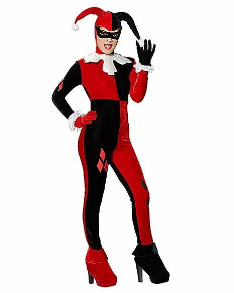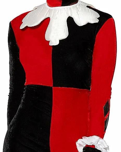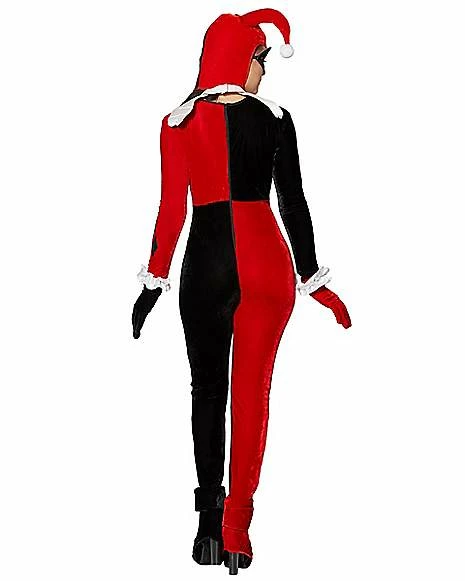 You’ll be nothing to laugh at when you don this sinister and officially licensed Harley Quinn costume. Even as the Jokers girlfriend, this outfit is no joke, complete with black and red jumpsuit, collar, eye mask, gloves, wrist ruffles and jester headpiece.