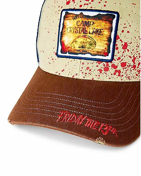 Let everyone know what your favorite horror movie is when you wear this official Friday the 13th Camp Crystal Lake trucker hat! With its blood-spatter pattern across the front, this hat will have you rocking killer style.