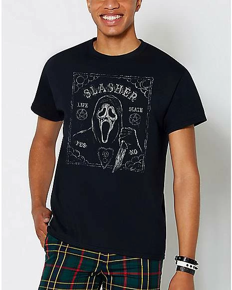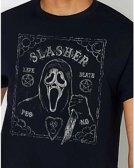 Style up like your favorite slasher with thisย Ghost Faceยฎ Pentagram T Shirt! This officially licensed tee features your favorite horror icon, Ghost Face, and is adorned with Ouija and pentagram detailing. Once you add this tee to your wardrobe, everybody will know just how much you love horror!