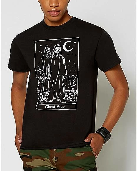 Showcase your spooky side in this Ghost Faceยฎ tarot tee. Featuring an image of the scary slasher himself in a tarot card, this cotton t-shirt definitely predicts that your future will be terrifying.