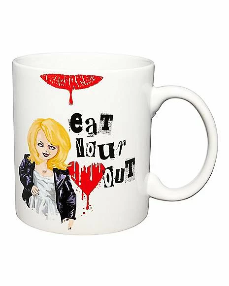 Drink up with a side of horror with this official Chucky mug! This white coffee mug features Tiffany and the words “eat your heart out,” with a dripping heart. It’s the perfect vessel for any Chucky fan.